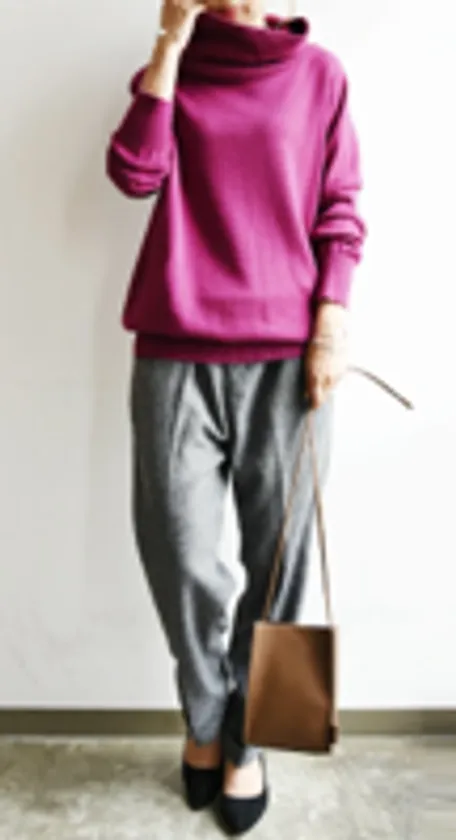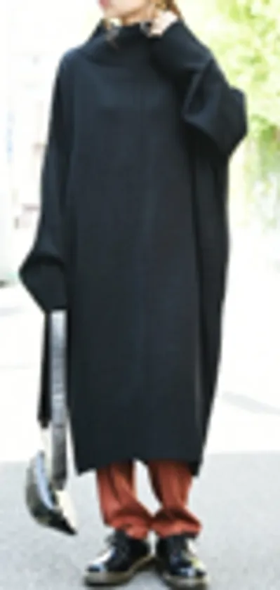 「ボトルネックって、私、初めて聞きました…知ってました?」との内田さんの問いかけに、「…知ってました!名前は。でも形状はあまり意識したことがなかったので(笑)」とパントビスコさん。一般的なハイネックのようにきゅっと詰まる感じもなく、ゆったりとして首周りに余裕があるシルエットは、中にタートルネックインナーを着てもスッキリ見えて、しかも暖かい!有難い冬のお洒落コーデが1枚で完成します。