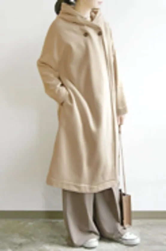 程よい厚さの生地感に柔らかい裏起毛素材で、軽やかさと暖かさを兼ね備えたフード付きのロングコート。前を開けてさっとラフに羽織っても、アクセントになる上のボタンを留めて着ても、形態安定仕様で綺麗なシルエットが保たれるのは嬉しいポイントです。裏起毛部分は、毛羽が少なくピリングが起きづらい素材のため毛玉ができにくく、長く愛用できそうです。ブランドの新シリーズ「emural(エミュラル)」は、気取ることなくサラリと身に纏うことができる風合いのある素材が主体となっており、“ナチュリッシュ”(ナチュラル&スタイリッシュ)な世界観が伝わってきます。