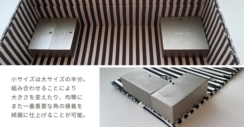 手づくりをする際に使用する生地やパーツは大きさも使い方も様々です。例えばクラフト・カルトナージュのような接着を必要とする作品の場合、接着の際に利用する重りは作るものの大きさにより変える必要性がありますが、四角形の文鎮であれば組み合わせることにより大きさを変えることもでき、均等にまた一番重要な角の接着を綺麗に仕上げることが可能です。