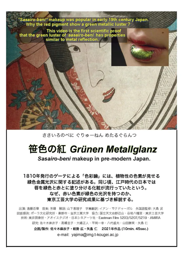 本作品は、「江戸の昔に流行した笹色の紅化粧の色彩の謎、なぜ赤い紅花色素が緑色の光沢を見せるのか」を、工学と芸術を融合してまとめ上げた東京工芸大学独自の共同研究による映像作品です。