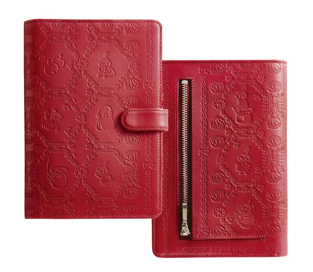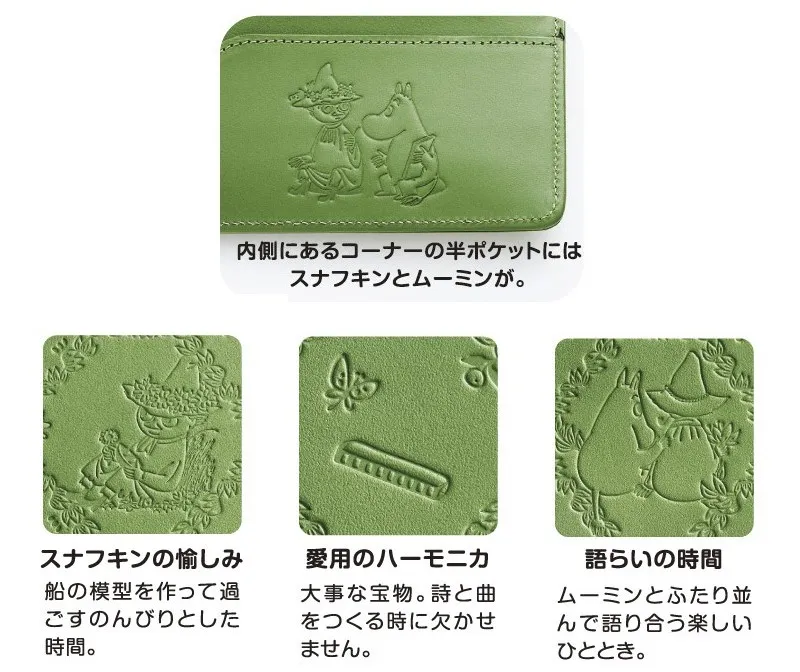 明るいビタミンカラーの高級牛革に型押しされたリトルミイやスナフキンに、ホッとなごむ手帳タイプのウォレットです。