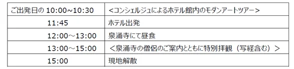 内容:泉涌寺の僧侶のご案内とともに特別拝観、コンシェルジュによるホテル館内のモダンアートツアー、昼食