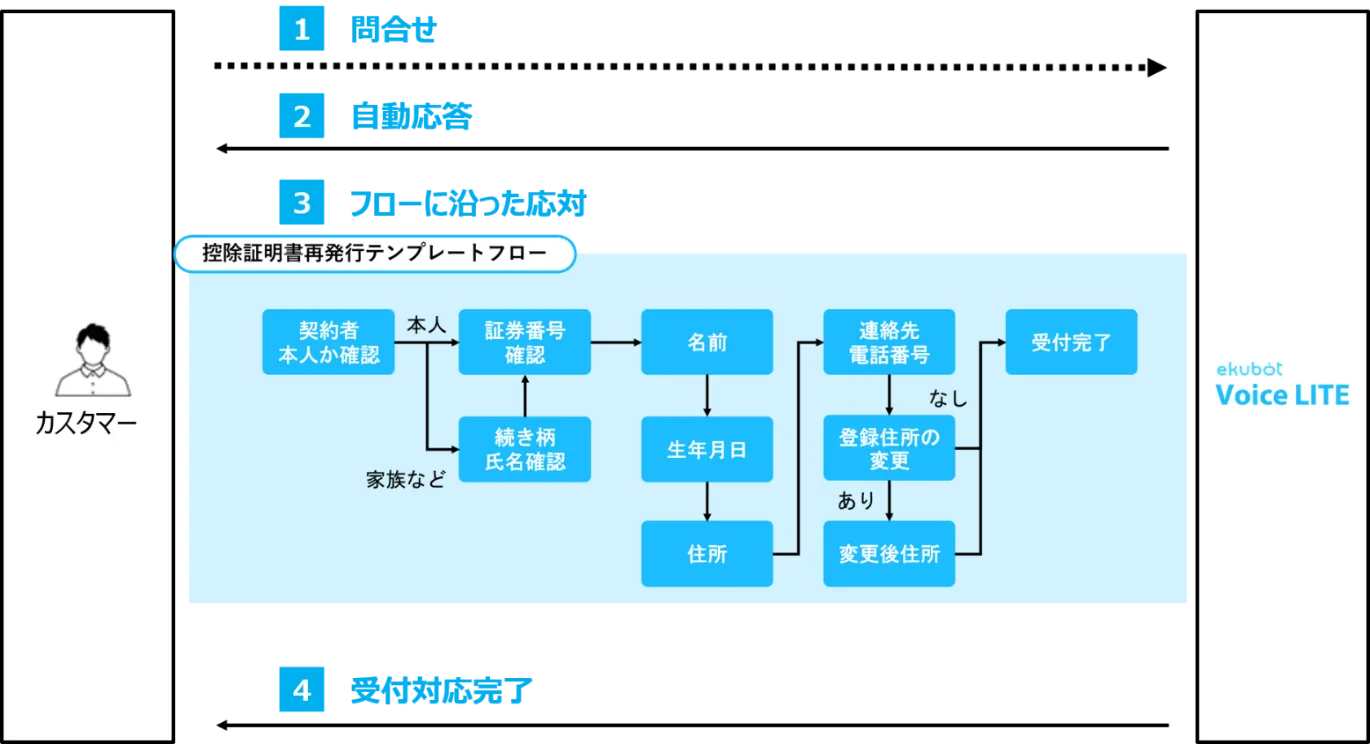 そこで当社では、「ekubot Voice LITE」に、当社の保険業界での業務運用ノウハウを基にした、控除証明書の再発行受付のシナリオテンプレートを組み込むことで、容易に利用開始できるよう本機能の開発に至りました。
