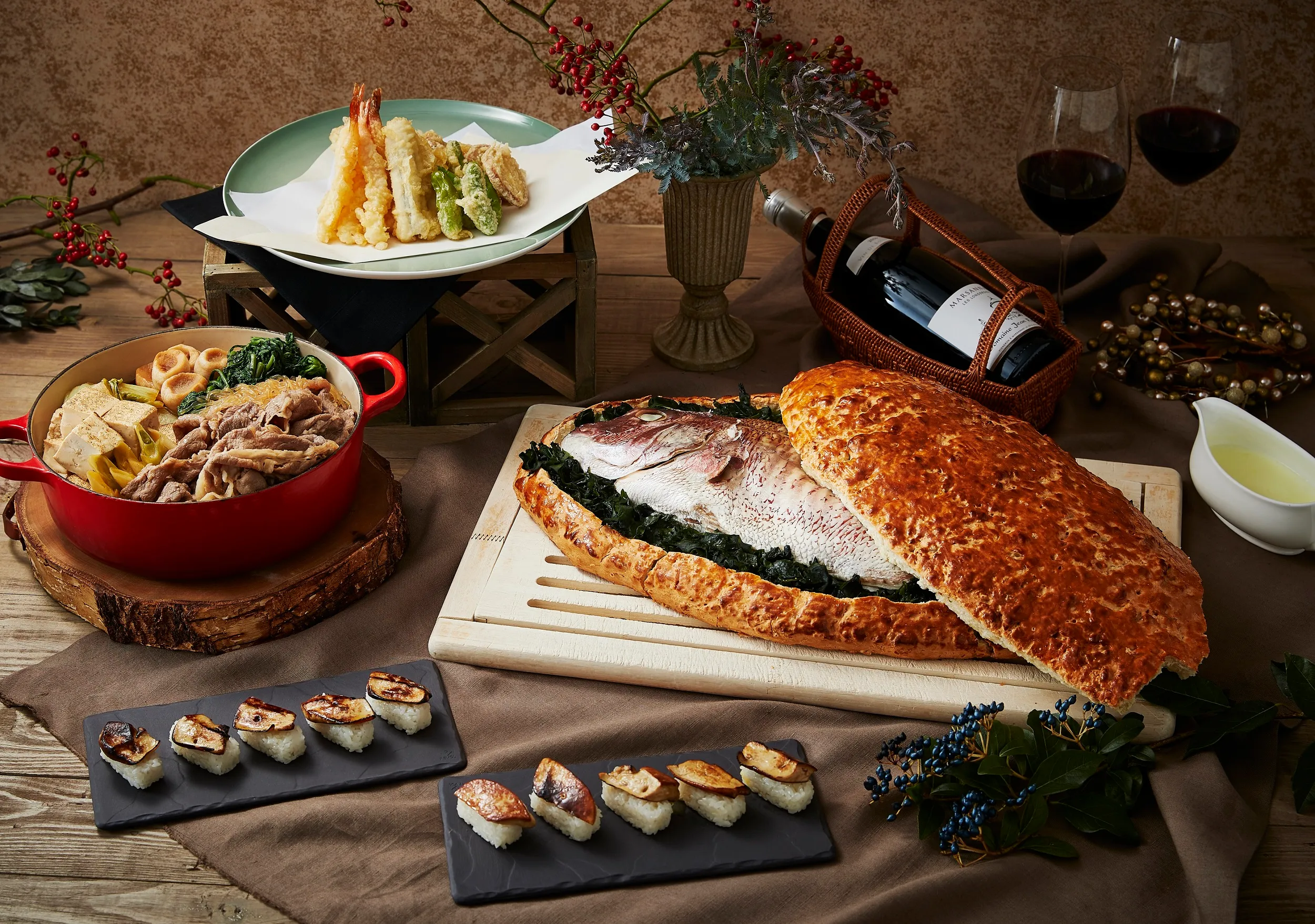 正月のおせち料理や、ディナー限定で「鯛の塩釜焼き」や「フォアグラ寿司」「すき焼き」などをご用意いたします。