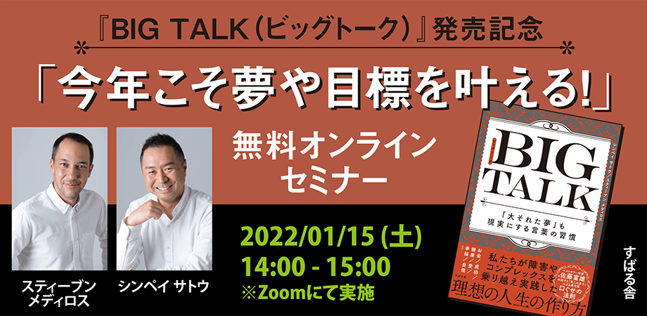 『BIG TALK(ビッグトーク)』発売記念 「今年こそ夢や目標を叶える!」無料オンラインセミナー 〜著者のシンペイ サトウ氏とスティーブン メディロス氏による願望実現のための方法論が明らかに〜