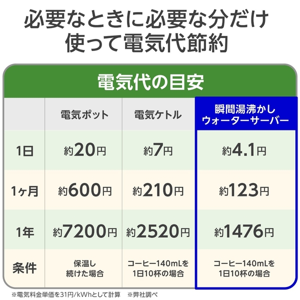 電気ポットのように保温する必要がなく、必要な時だけ加熱するため、電気代の節約にも貢献します。