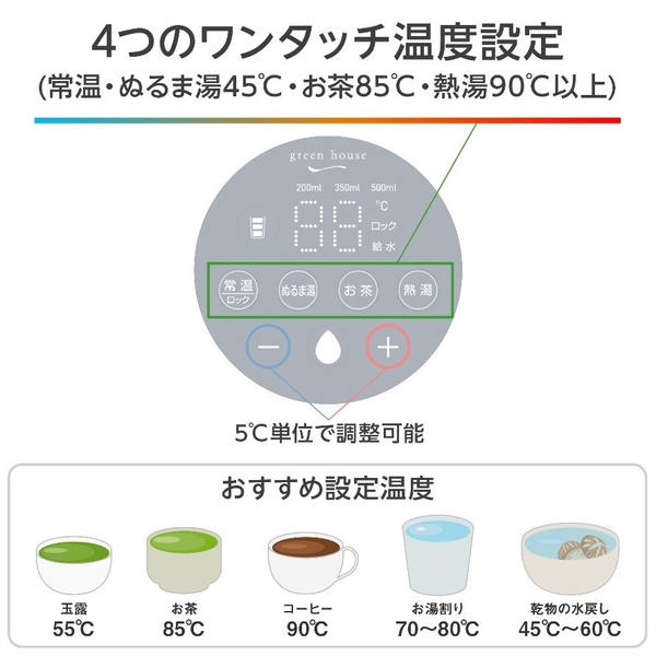 ■4つのワンタッチ温度設定(常温・ぬるま湯45℃・お茶85℃・熱湯90℃以上)5℃単位で調整可能