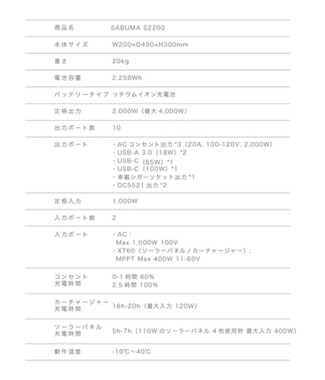 ・ほぼ全ての家庭用電気製品が長時間使用可能な定格出力2000W