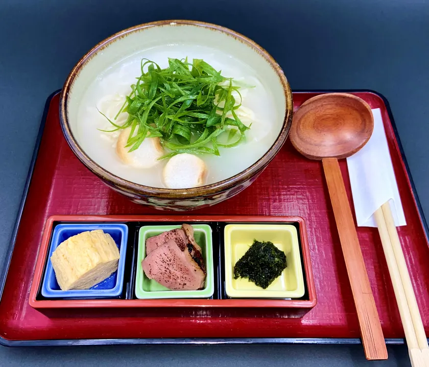 女性をターゲットにコラーゲンたっぷりの濃厚鶏白湯スープにこだわりの中細麺、別盛り皿には炙り合鴨、生姜だし汁巻き、生のり鰹が乗せられており今までにない究極のらあめんです。