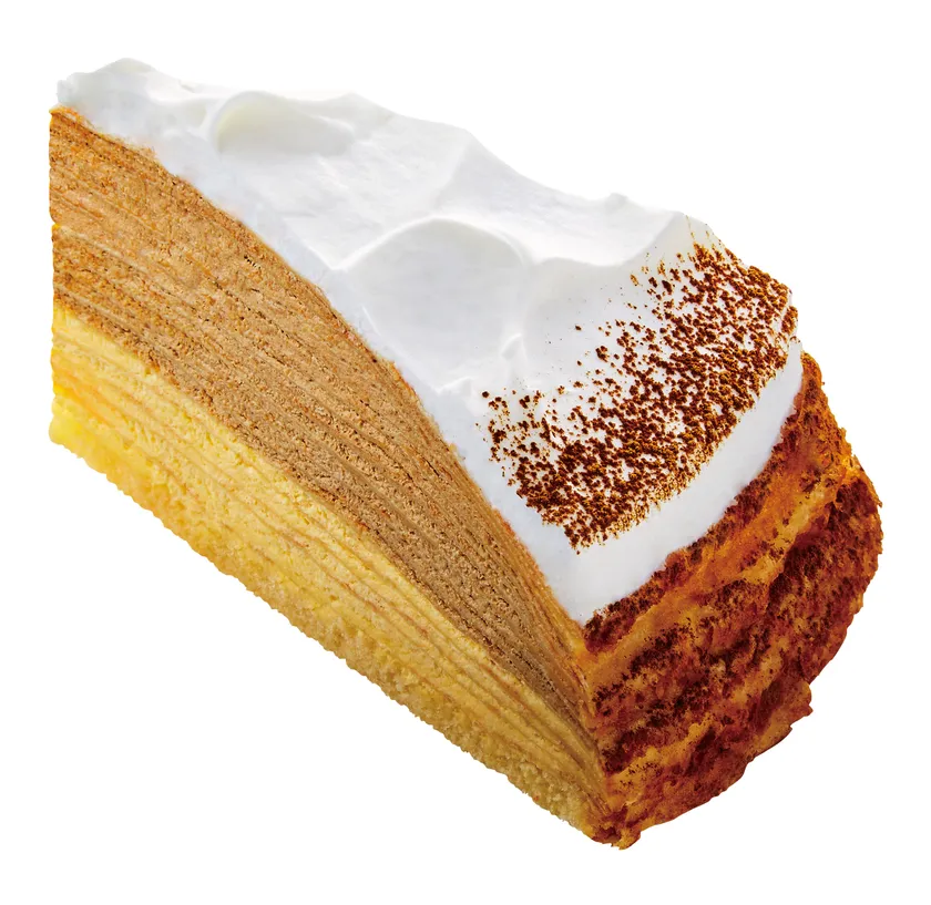 紅茶の濃厚な香りと味わいを存分に楽しめるミルクレープ。ふんわりスポンジの上にカスタードクリームとミルクティクリームを重ね、ホイップクリームのデコレーションと紅茶パウダーで仕上げました。ミルクティクリームには、優美で繊細な香りとコクをもつ上質なセイロン紅茶と、ミルクとの相性がよい優しくフレッシュな香りのケニア産紅茶を使用。カスタードクリームと一緒に頬張ると口のなかでとろけ合い、上品なミルクティの香りと味わいが広がります。コメダの紅茶やコーヒーと一緒にお楽しみください。