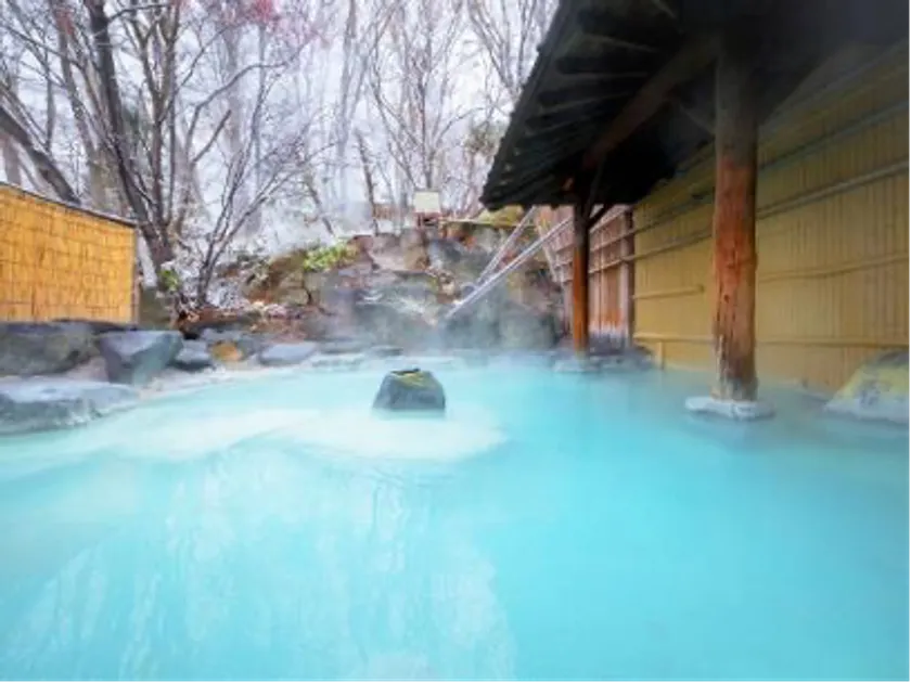 湯の花が咲くコバルトブルーの源泉かけ流し露天風呂。