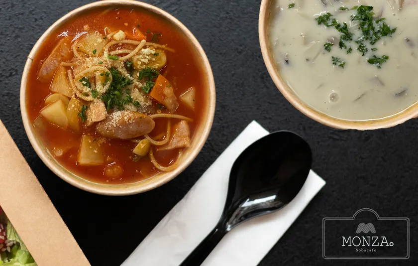 そばカフェMONZA。限定のオリジナルブレンドコーヒーと紅茶を提供。温かいスープはスノーアクティビティで遊び疲れた体に染み渡る。