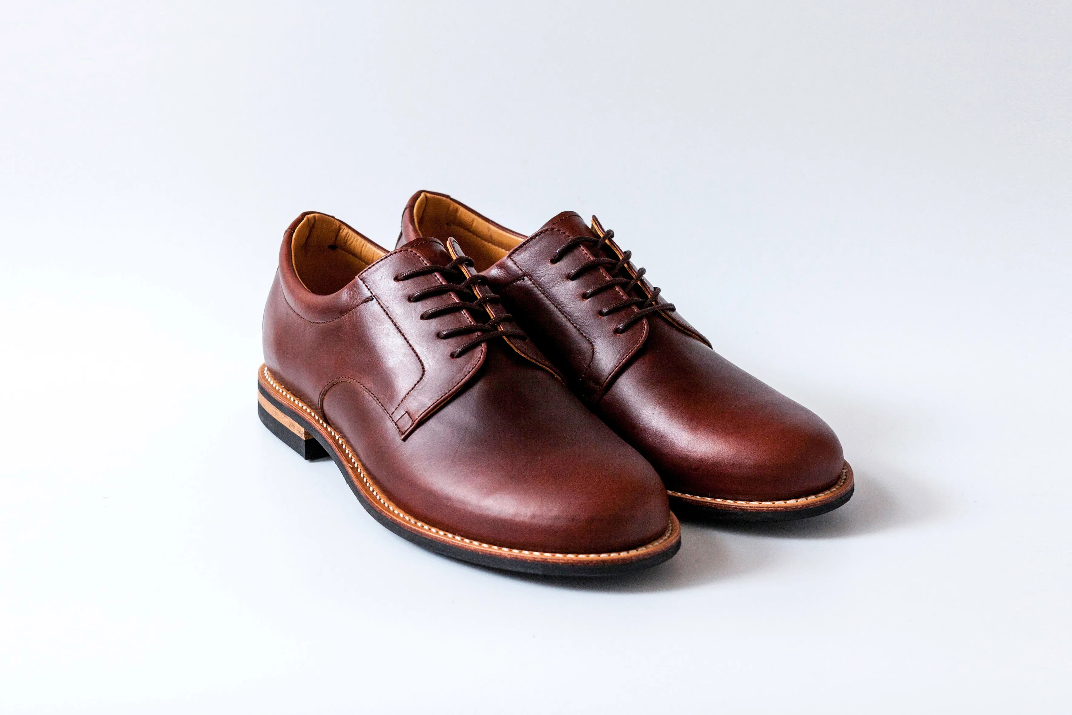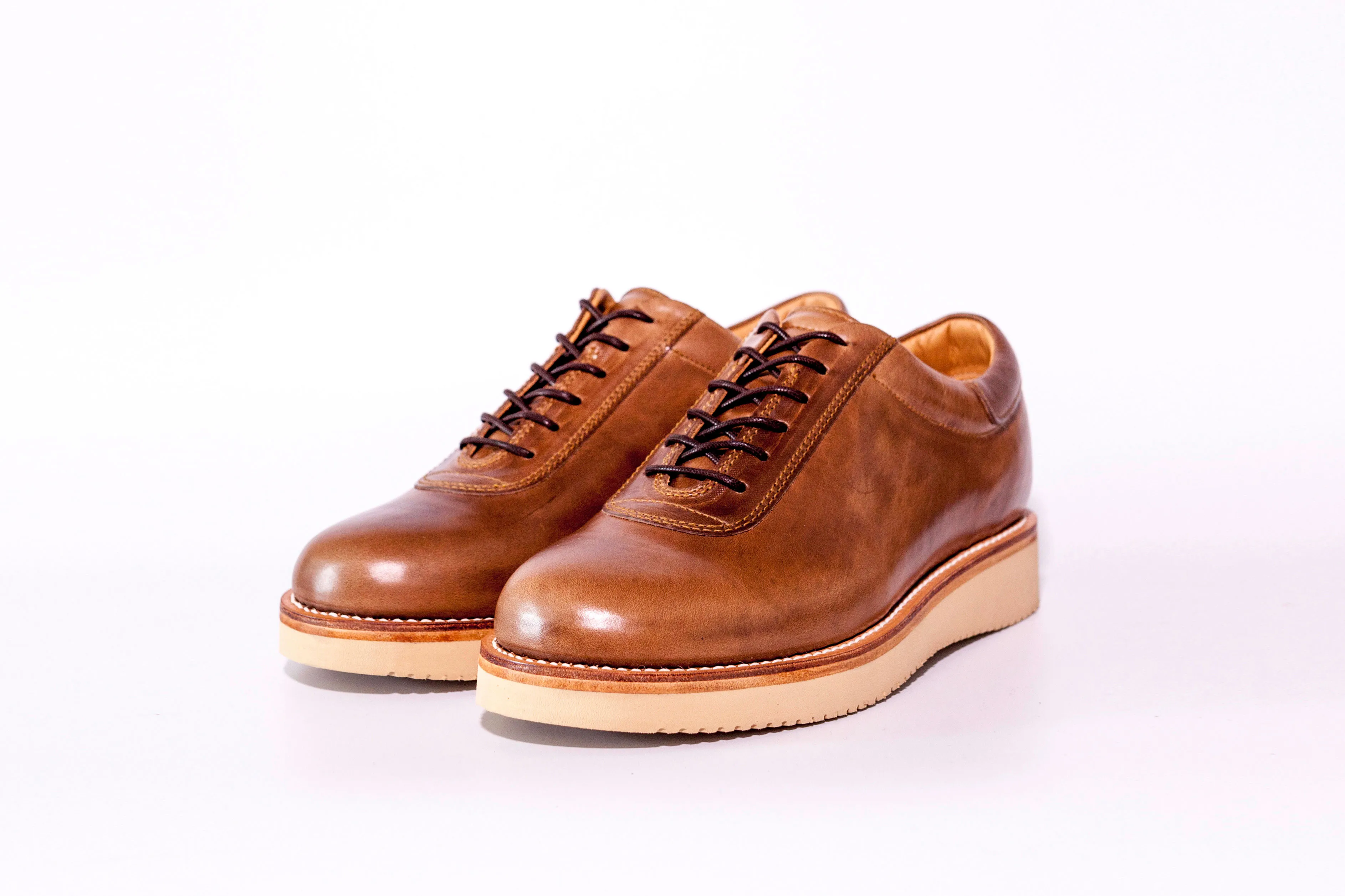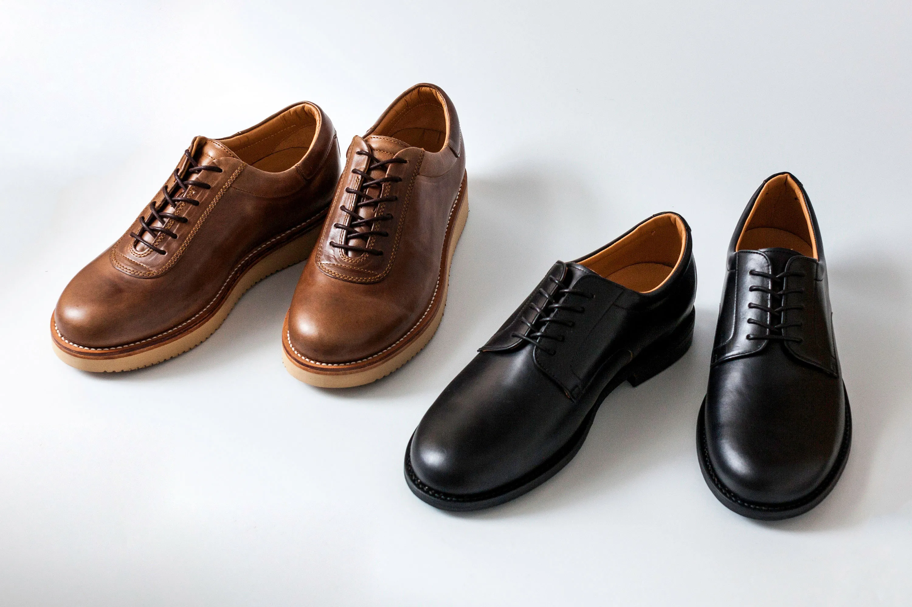 どちらも紳士靴のシルエットを取り入れた「ブルーオーバー」オリジナル木型を使用、トゥを少し長めに、ウエストを絞ったシャープなラストはシューズのフォルムが引き立つよう設計。紳士靴の骨格でありながらも、足あたりや履き心地はスニーカーの構造を取り入れています。ビブラムを使った加工底によるクッション性能と屈曲性あるソールユニット、履き口部分とベロの部分に5mmのスポンジを入れ、靴擦れや疲れを軽減。ステアレザーを張り合わせたカップインソールはかかとのグラつきを抑え、軽快な履き心地でありながら、高級感も感じさせます。