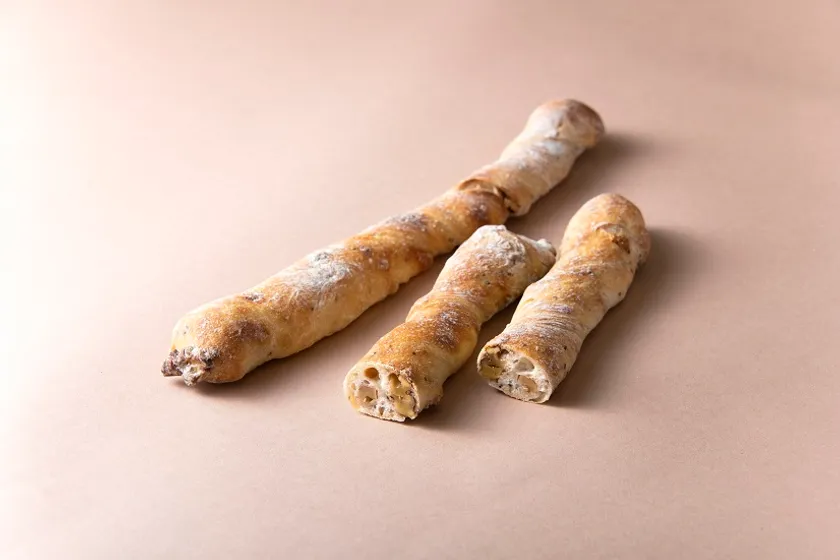 リュスティック生地で作ったおつまみパンです。くるみ、黒コショウ、フランスパン生地の組み合わせはこの上なく、適度な「引き」と「切れ」はビールや白ワインなどのおつまみにぴったりです。