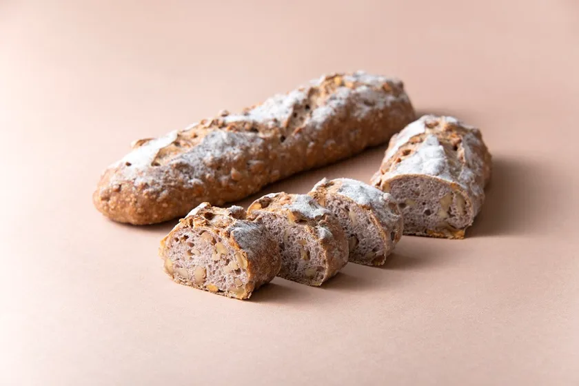 北海道小麦粉を使用したバケット生地にくるみをたっぷり練り込みました。自家製酵母を使用し、20時間以上発酵・熟成された生地は小麦粉の旨味を引き出し、もちもちした生地とくるみの食感を味わえます。シンプルな配合だけに正に「くるみ」を味わうためのパンです。