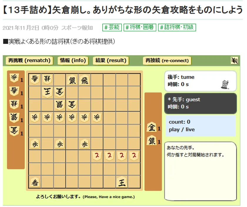 きのあ株式会社(代表取締役:山田 元気)は、スポーツ報知のWebサイト( https://hochi.news/ )にて、駒が動かせる実践詰将棋コンテンツを提供いたしました。スポーツ報知Webサイトでは、きのあ将棋提供の実践詰将棋だけでなく、将棋棋士でもあり詰将棋作家としても高名な伊藤果八段も連載されています。2021年10月半ばより試験的に掲載しておりましたが、この度、正式に提供を開始いたしました。