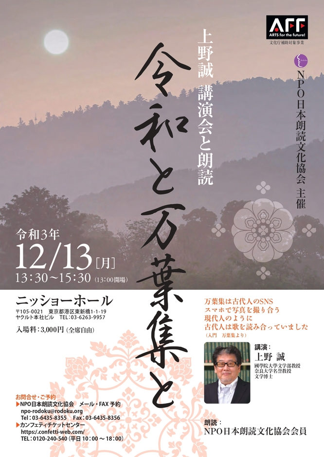 NPO日本朗読文化協会(名誉会長:加賀美幸子)主催による上野誠講演と朗読『令和と万葉集と』が2021年12月13日 (月)にニッショーホール(東京都港区)にて上演されます。チケットはカンフェティ(運営:ロングランプランニング株式会社、東京都新宿区、代表取締役:榑松 ⼤剛)にて発売中です。