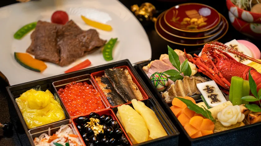 伊勢海老、牛肉八幡巻き、寒鱈柚子焼き、松笠慈姑、伊達巻き、鮑柔煮、干支大根