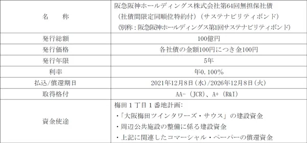 本日、阪急阪神ホールディングスは、「環境」と「社会」双方の課題解決に貢献する事業の資金調達手段として発行する、当社初の「サステナビリティボンド」の発行条件を決定しました。概要は次のとおりです。