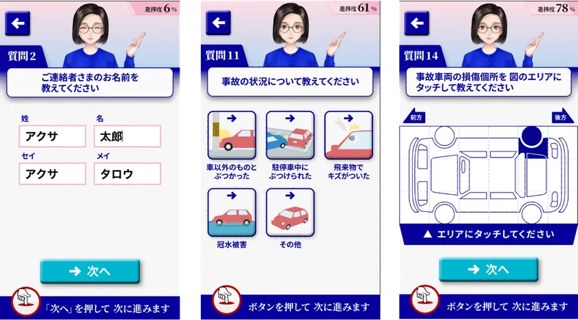 当社公式ウェブサイトのナビゲーターであるEmma(エマ)のサポートのもと、お客さまは動画を視聴しながらスマートフォンまたはパソコン画面上で事故状況を入力、タッチしてステップごとに申請を進めることができます。この動画に従って申請すると約3分で事故申請が完了するため、より分かりやすく、より簡単に事故申請をすることが可能となりました。また、受付完了後のアンケートにおいても、回答者の約96%から「(事故申請が)とてもしやすかった」「しやすかった」等の好意的な回答を得ました。さらに従来の文字入力によるウェブサイトでの事故受付に比べて、受付完了率が約50%以上アップしました。