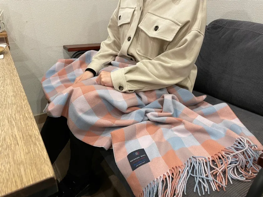 原料は当社別注の「マカロンウール」という軽くて膨らみのあるフランス羊毛を使用して超大判(幅140cm×長さ180cm(+フリンジが両サイド各10cm))のブランケットをつくりました。