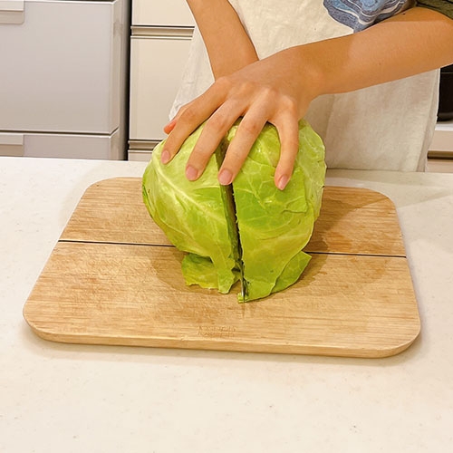 切り方は、葉をざく切りするよりも、芯を残したまま1/8個ほどにカットするがおすすめ。ボリュームが多い印象ですが、加熱後はカサが減るので、ぺろりと食べられますよ!