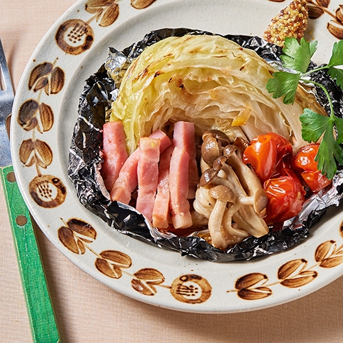 春キャベツのほか、この時期が旬の新たまねぎや新ジャガイモなど、水分を多く含んでいる野菜を一緒に焼くのもおすすめです。塩・コショウ、お好みでコンソメを入れると、野菜からあふれ出た水分でポトフのような味わいを楽しめますよ。