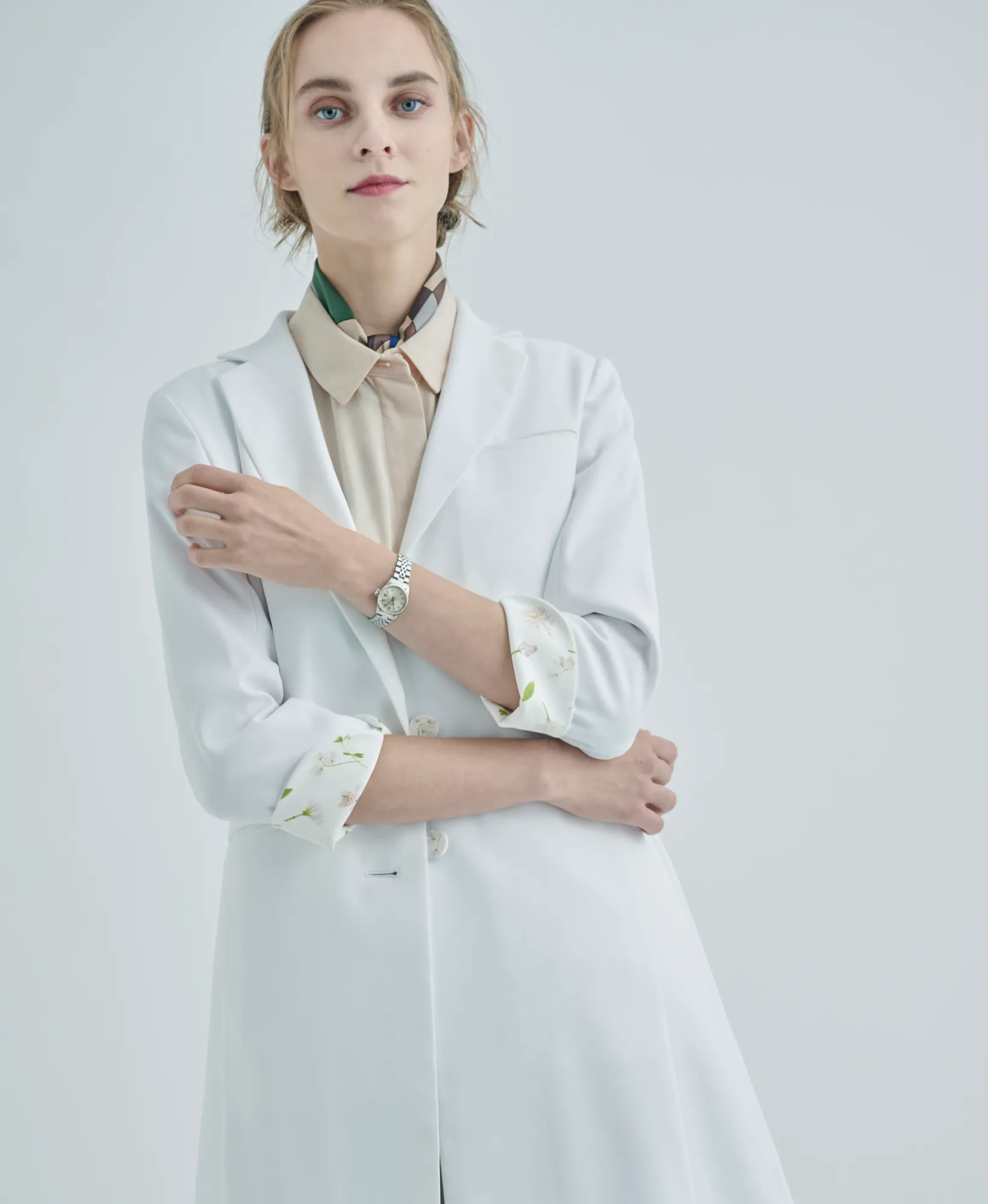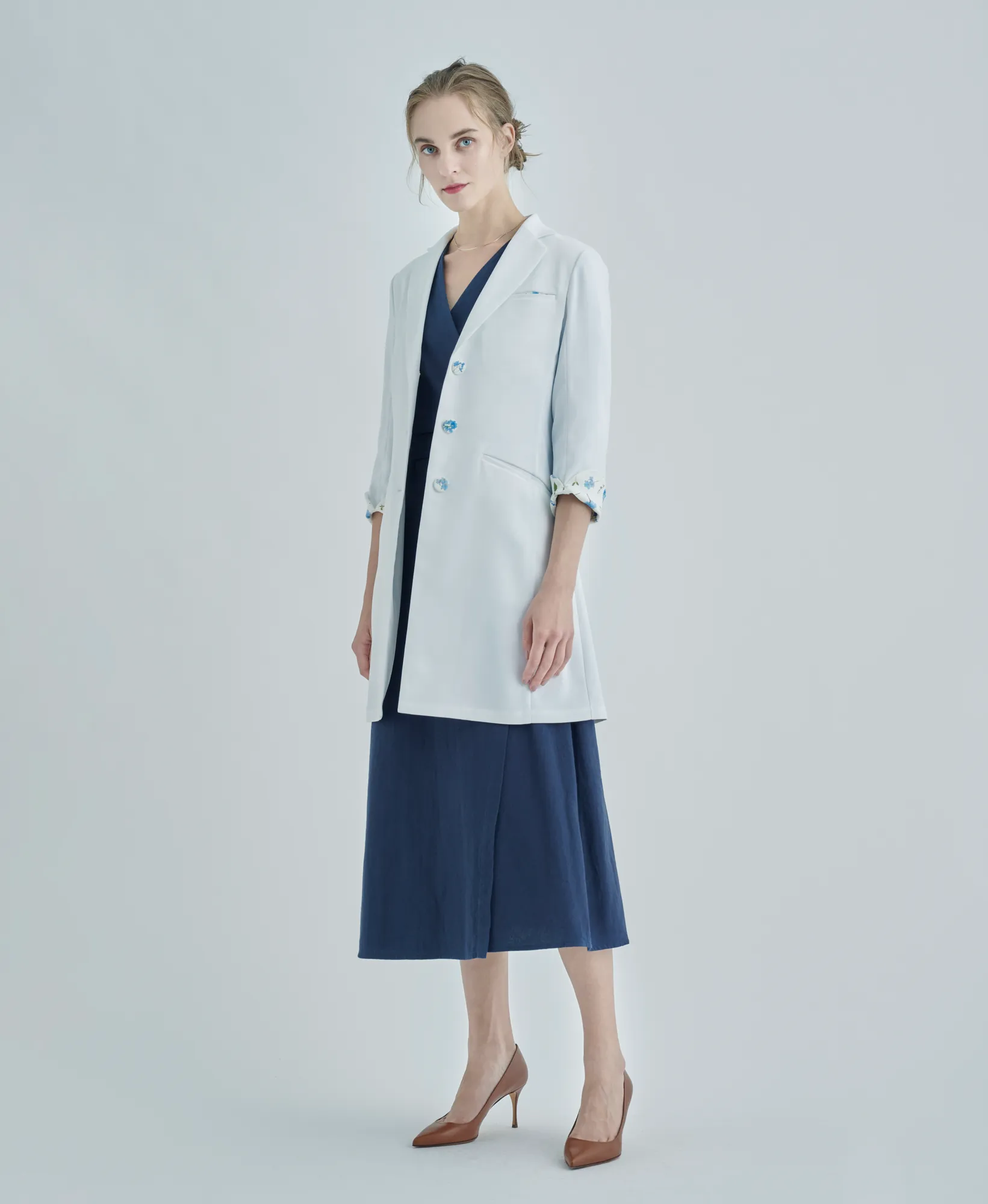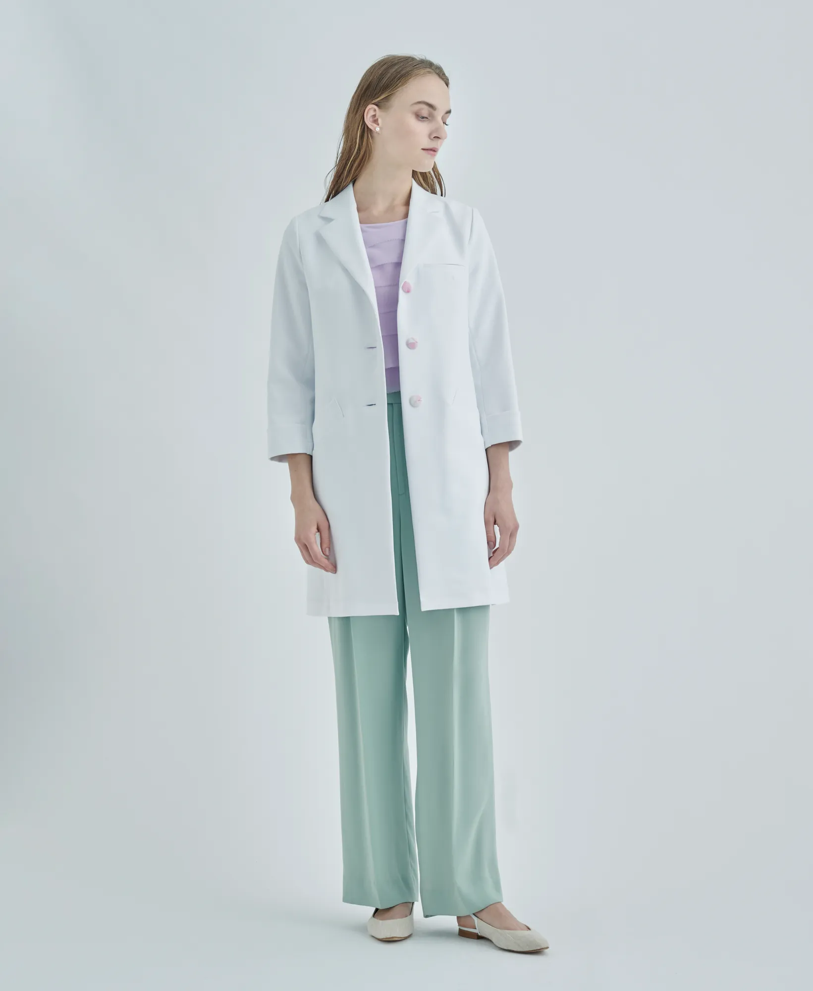 「オーソドックスで包容力のあるシルエットは、パステルカラーやシフォンなどの女性らしいアイテムとも好相性。白衣でもミックスマッチが叶う。肉厚なドクターコートと、柔らかな素材とのコーディネートでソフトで優しい印象へ。」