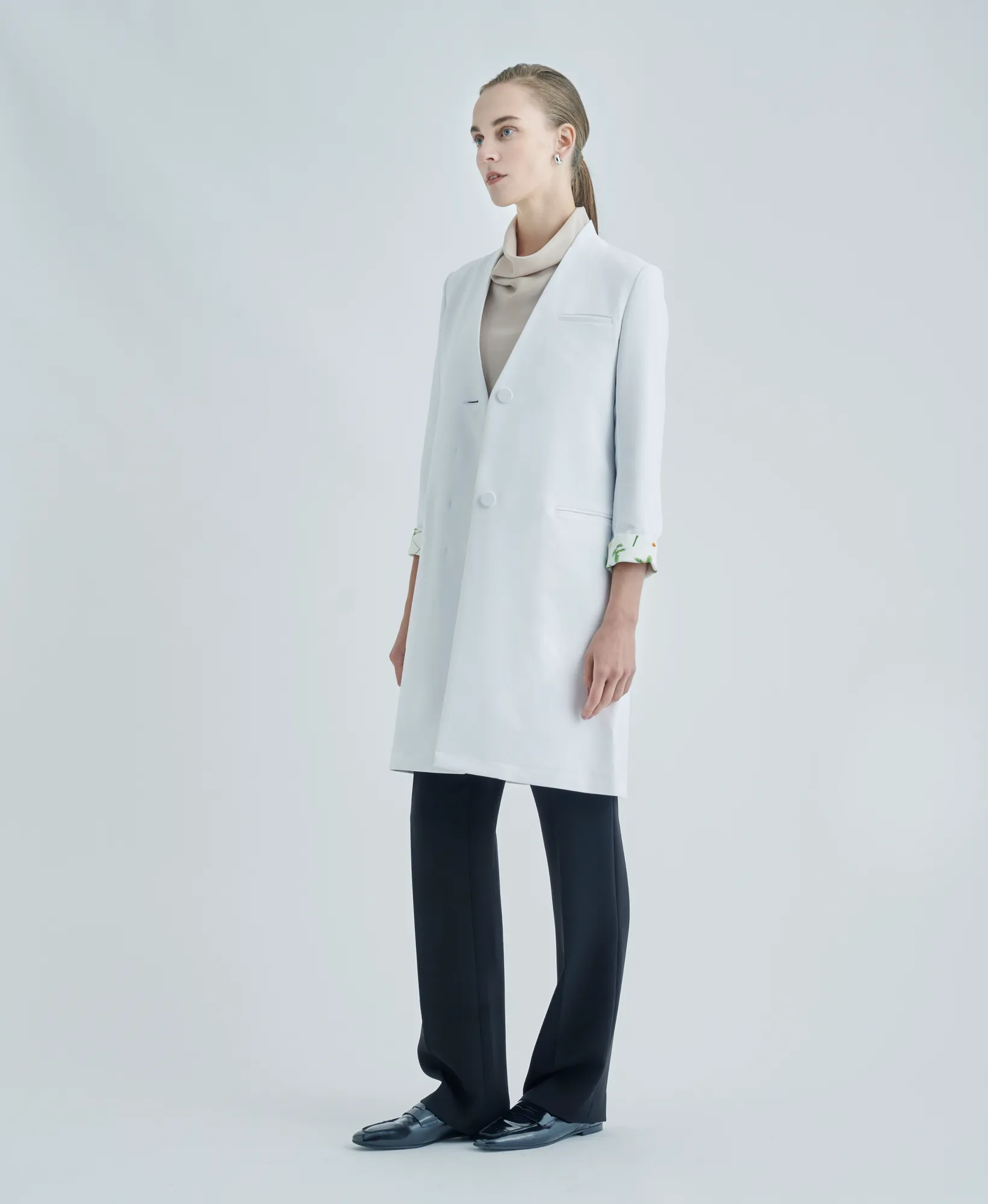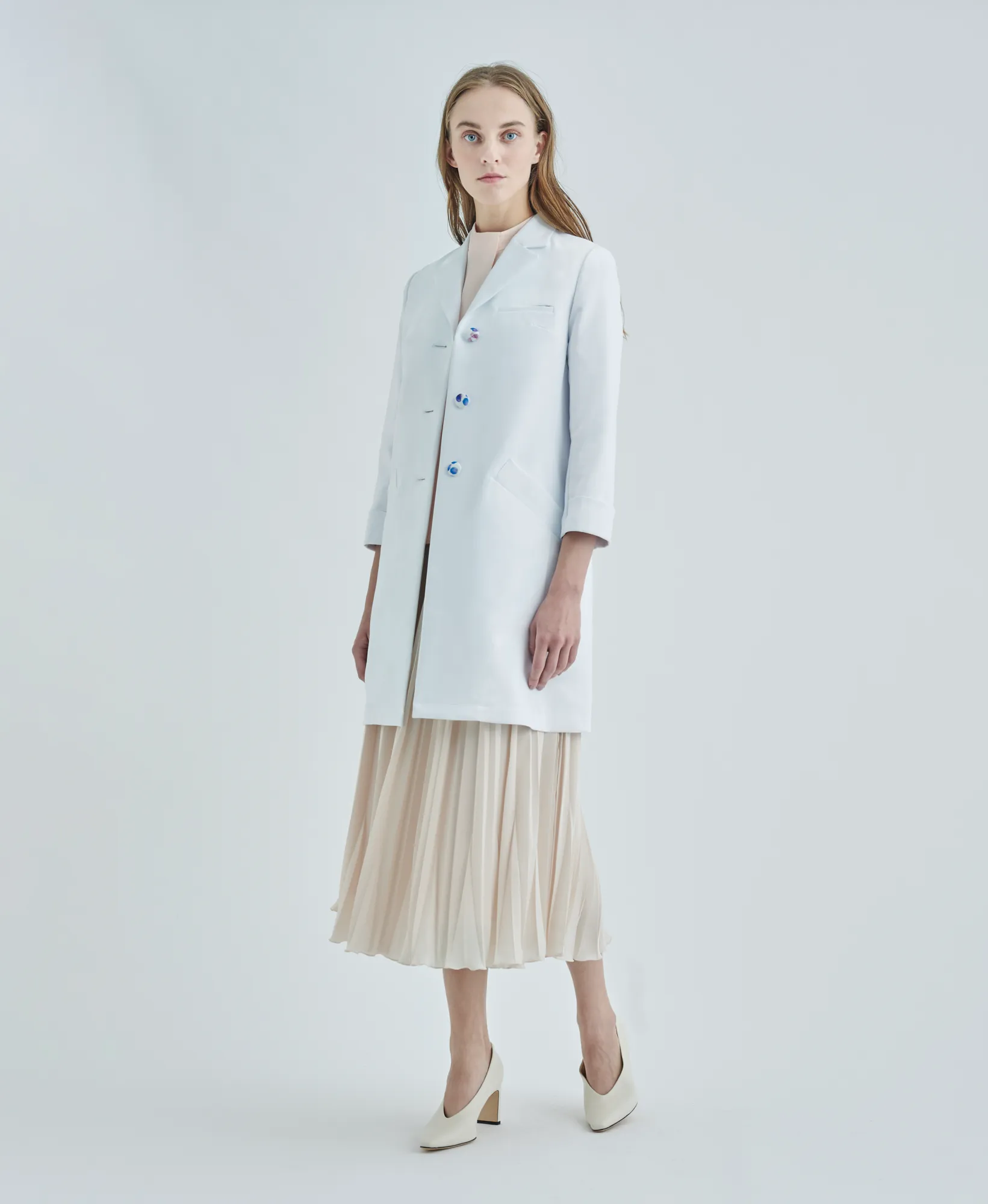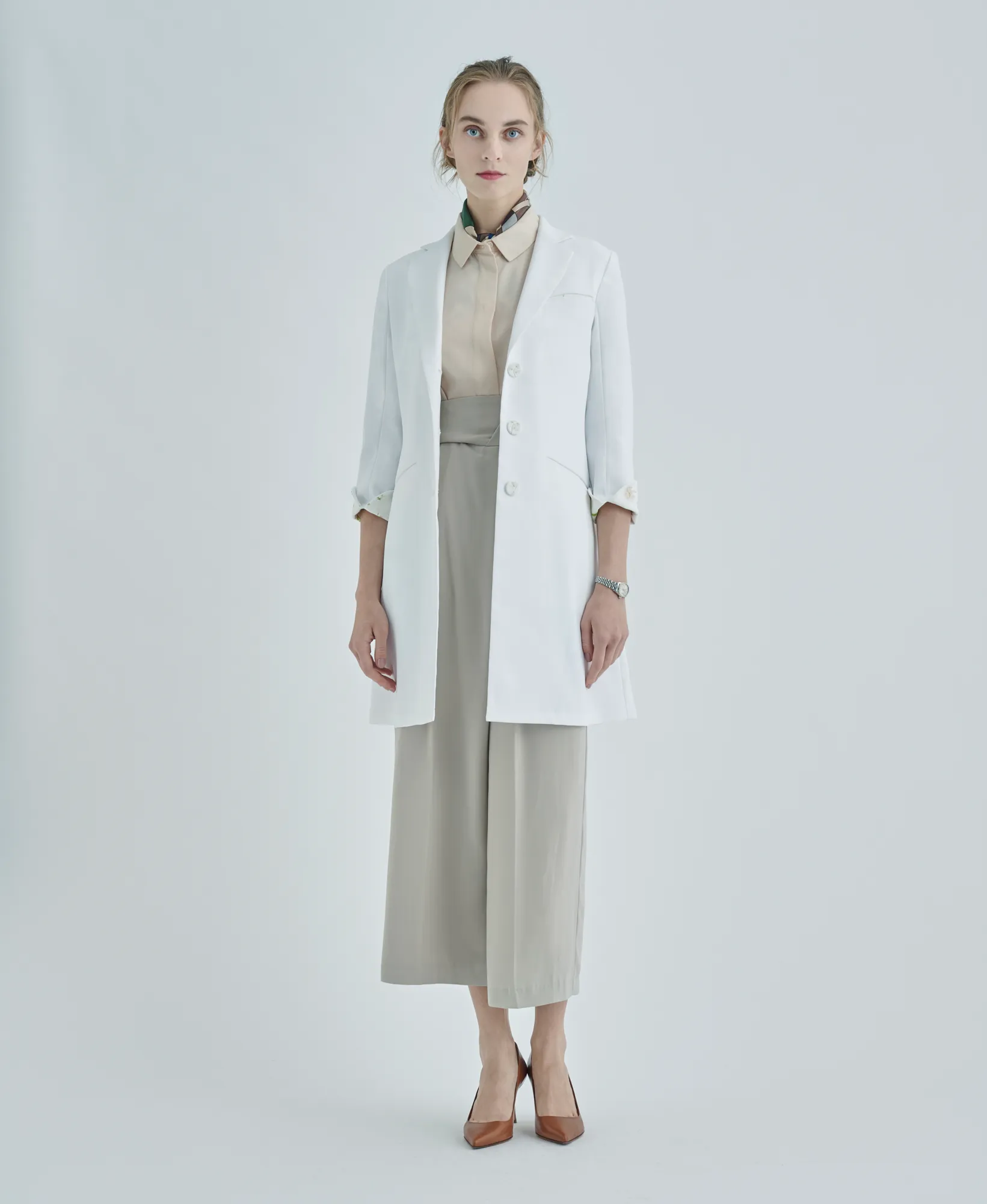 「オーソドックスで包容力のあるシルエットは、パステルカラーやシフォンなどの女性らしいアイテムとも好相性。白衣でもミックスマッチが叶う。肉厚なドクターコートと、柔らかな素材とのコーディネートでソフトで優しい印象へ。」