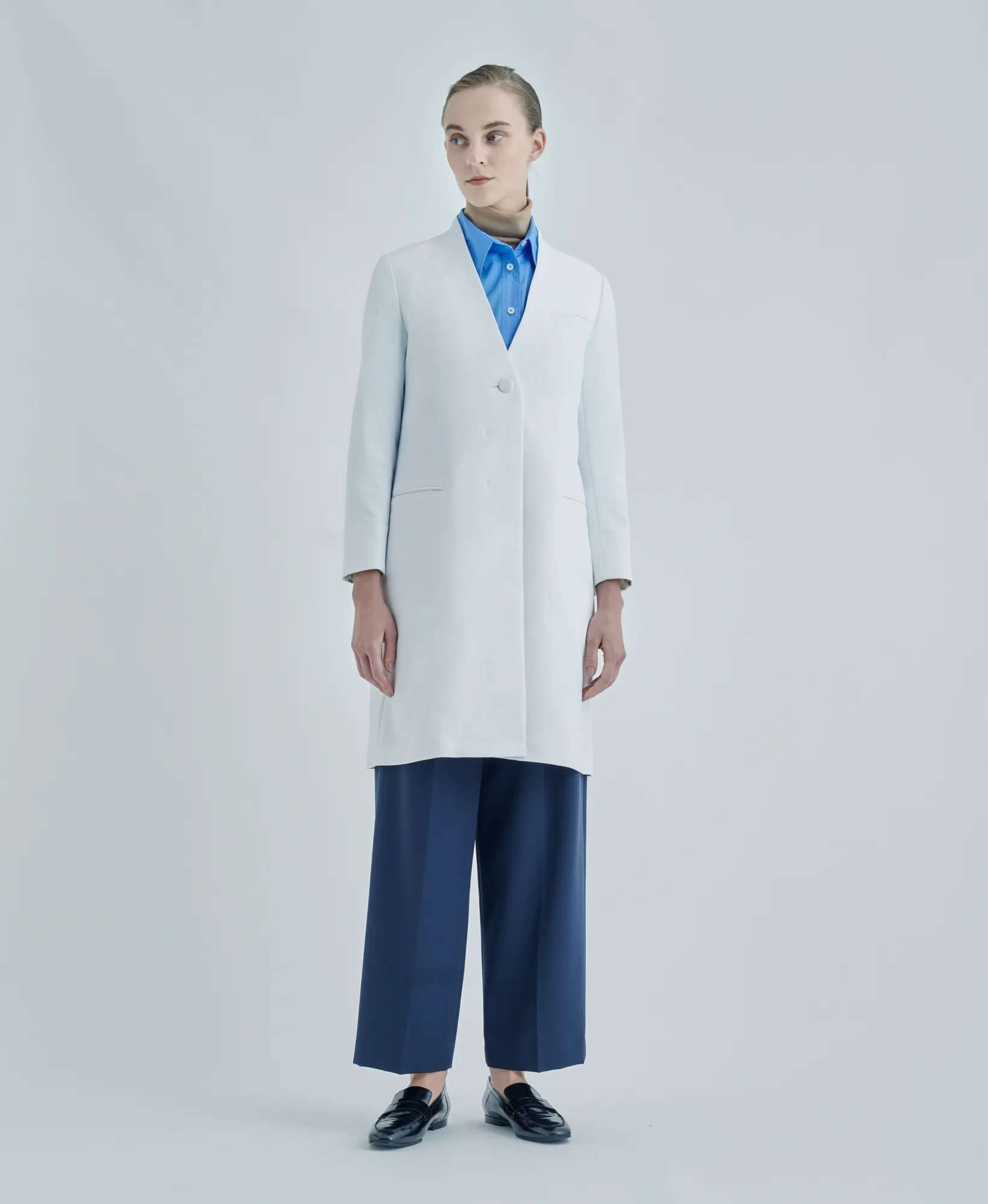 「タートルネックにシャツを合わせるなど個性を感じる襟元の遊びはノーカラーだからこそ。中に合わせるアイテムの色や素材のコントラストを楽しむほど清廉としたスタイリングへ。」