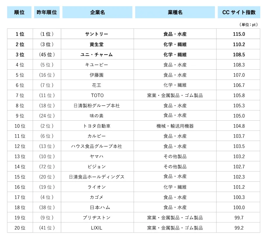 ■ サントリーが3年連続トップに、3位のユニ・チャームは昨年より大幅ランクアップ