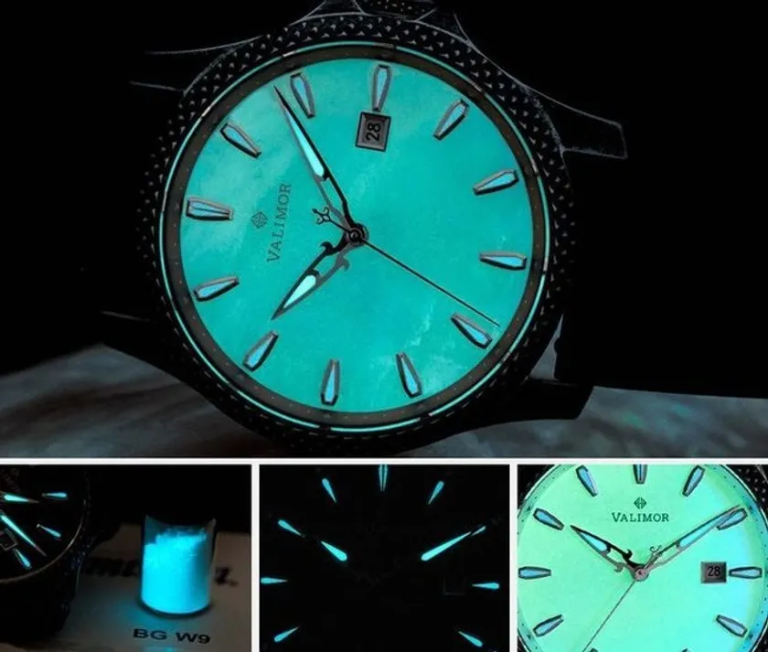日中に太陽の光を吸収し、暗闇の中で針や文字盤がはっきりとした青色の光を発します。