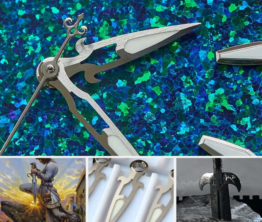 アーサー王物語でアーサー王が敵の軍勢470人を倒したとされる、伝説の剣「カリブルヌス」の名を冠したシリーズです。文字盤にはオパールやマザーオブパールをはめ込み、時分秒針は、アーサー王の剣にふさわしく、すべて剣の形にデザインされています。
