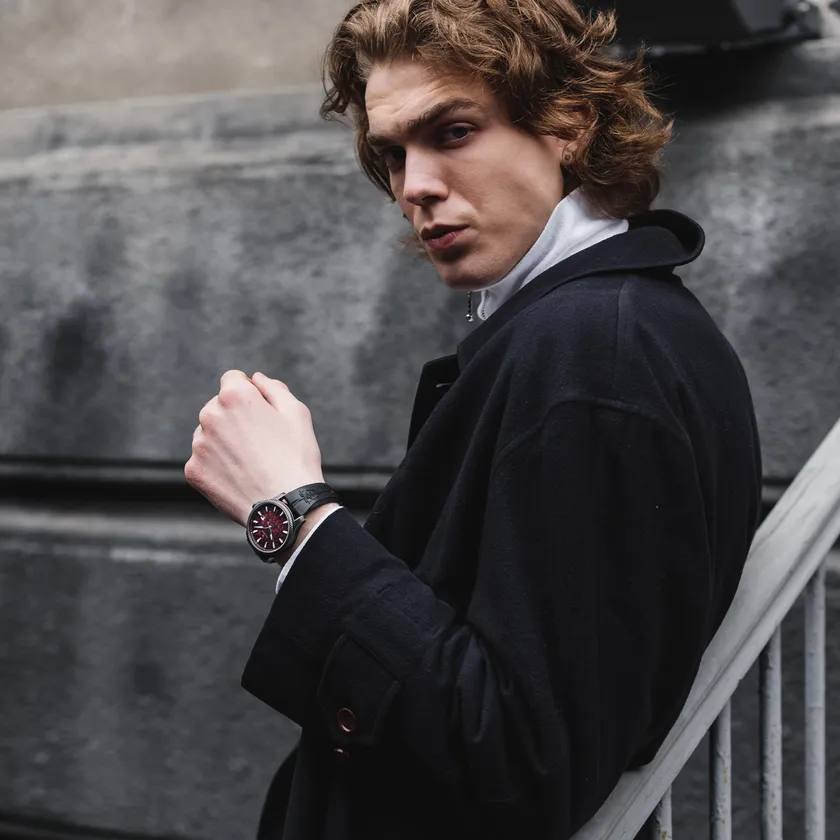 時分秒針はサーベルのように研ぎ澄まされ、剣を備えた重厚な腕時計は、身につける者の闘志を奮い立たせてくれます。