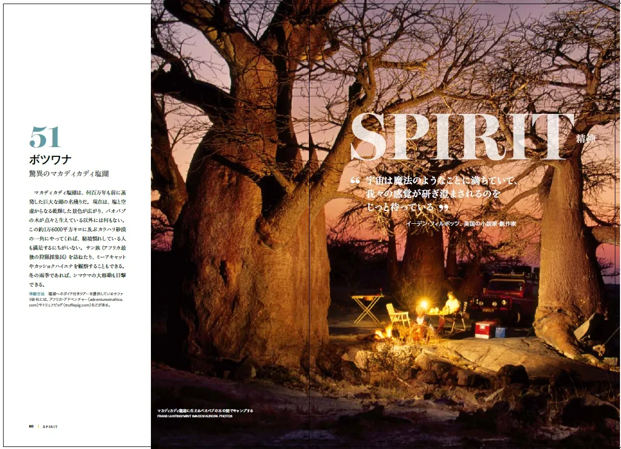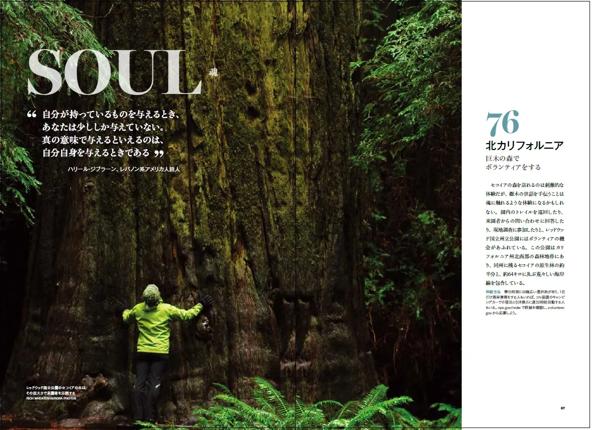 それぞれの場所での旅の楽しみ方を「文化に触れる」「身体を動かす」「自分を見直す」「地域活動に参加する」の4つのテーマに分け、イタリアで絵画教室に通う、スウェーデンの雪原を犬ぞりで駆けるなどの体験型ツアーを紹介。そして、全ての旅行には、すぐにアクセスできる紹介URLを記載しています。さらに、他のガイドブックと一線を画すのは、ナショナルジオグラフィックらしい「クロスリバーゴリラを絶滅から守る」ほか、動物の保護や自然環境保全などのボランティア体験を特集した「地域活動に参加する」の掲載です。ただの旅行ではない、そこで何を体験するかに重きを置く、新しい観光ガイド。豊かな行動体験を求める方、そして、自宅にいながらも旅行気分を味わいたい方、この年末年始、必見の一冊です。