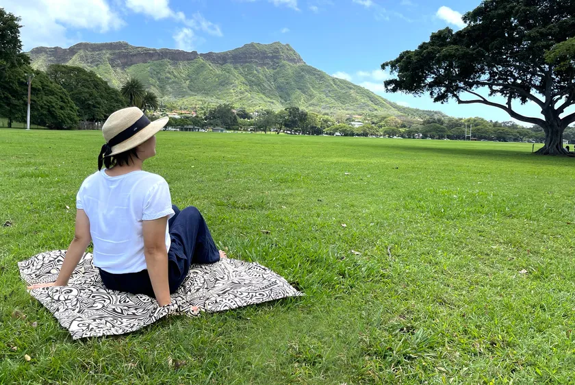 ハワイアン風呂敷を敷いてダイヤモンドヘッドを眺め休憩中のスタッフ。カピオラニ公園。