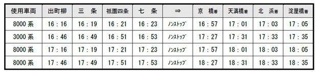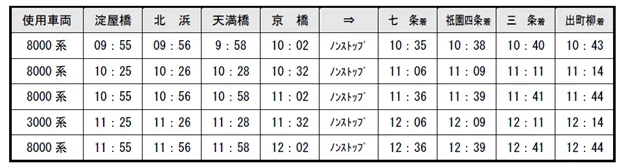 (2)停車駅:淀屋橋、北浜、天満橋、京橋、七条、祇園四条、三条、出町柳