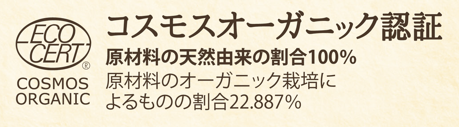 本製品は、世界最大のオーガニック認証機関、エコサートが認証する「コスモスオーガニック認証」を取得。世界統一のオーガニック基準をクリアしています。