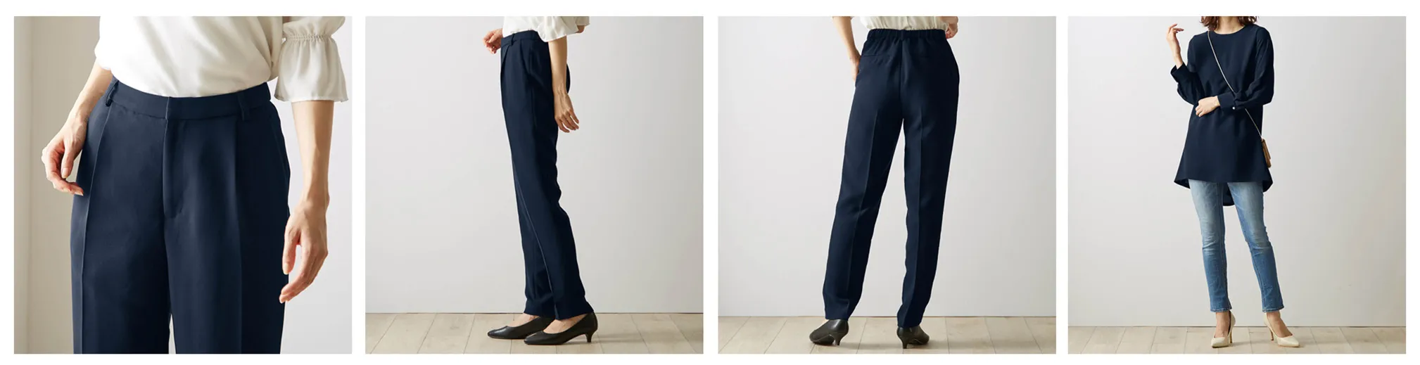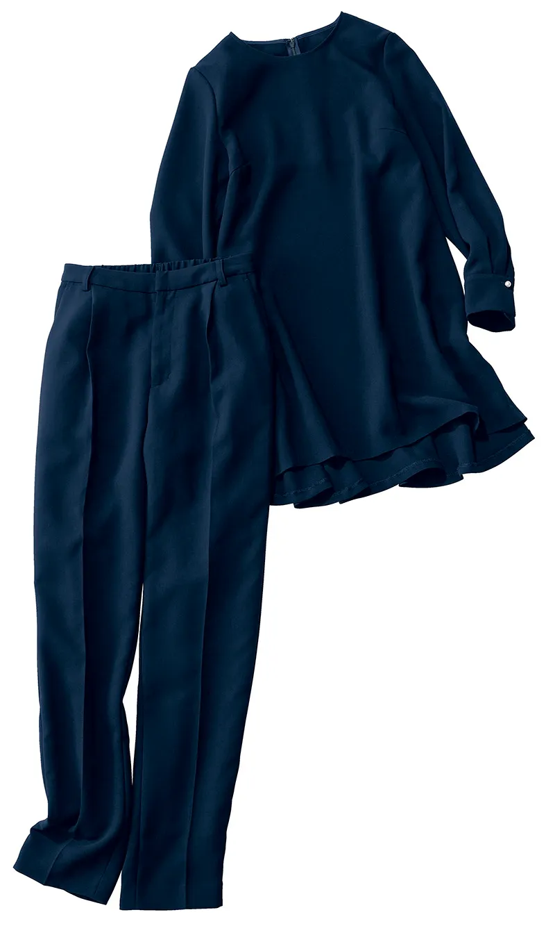 今回、アンケート結果を参考に開発したスーツは、デザインや着心地を細部までこだわりました。トップスのチュニックブラウスは、前後差があるデザインのため体型をカバーしながら美しいシルエットを実現しました。パンツは後ろゴムのラクな履き心地で、裾へ向かって細くスッキリ見えるワンタックのテーパードパンツです。