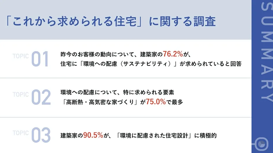 【イマ、求められる住宅とは?】建築家の76.2%、「環境への配慮(サステナビリティ)」が求められていると回答