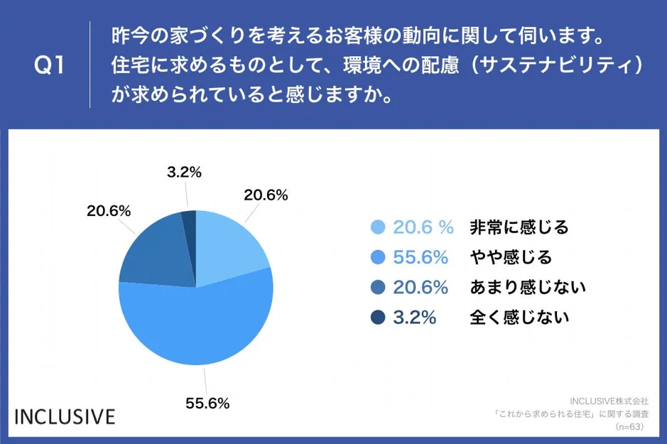 「Q1.昨今の家づくりを考えるお客様の動向に関して伺います。住宅に求めるものとして、環境への配慮(サステナビリティ)が求められていると感じますか。」(n=63)と質問したところ、「非常に感じる」が20.6%、「やや感じる」が55.6%という回答となりました。