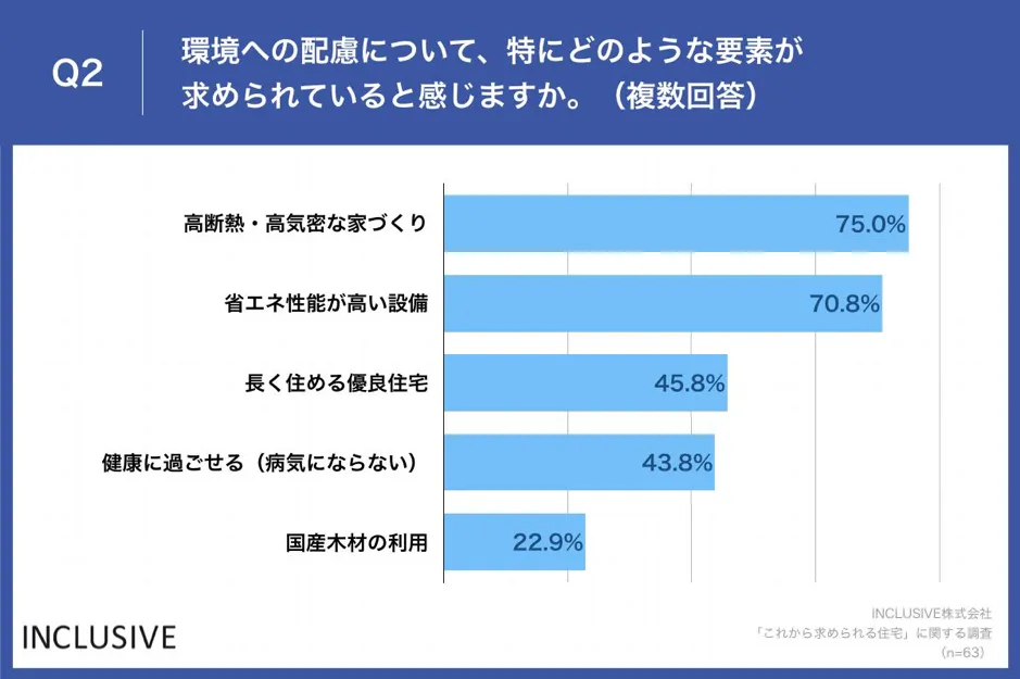 「Q2.環境への配慮について、特にどのような要素が求められていると感じますか。(複数回答)」(n=63)と質問したところ、「高断熱・高気密な家づくり」が75.0%、「省エネ性能が高い設備」が70.8%という回答となりました。