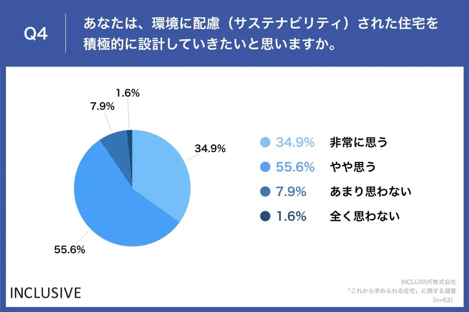 「Q4.あなたは、環境に配慮(サステナビリティ)された住宅を積極的に設計していきたいと思いますか。」(n=63)と質問したところ、「非常に思う」が34.9%、「やや思う」が55.6%という回答となりました。