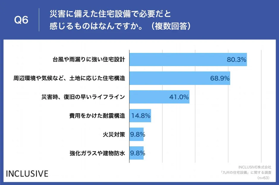 「Q6.災害に備えた住宅設備で必要だと感じるものはなんですか。(複数回答)」(n=63)と質問したところ、「台風や雨漏りに強い住宅設計」が80.3%、「周辺環境や気候など、土地に応じた住宅構造」が68.9%、「災害時、復旧の早いライフライン」がが41.0%という回答となりました。