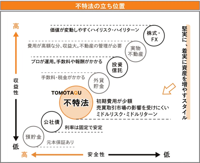 不動産特定共同事業法に基づき、出資者からの資金をもとに事業者が不動産を運用し、賃貸収入や売却時の利益を配当として出資者へ分配をする投資手法である。通常、不動産投資を行う場合は資金、銀行融資、賃貸管理など頭を悩ませる事項が少なくない。しかし、その点で不特法商品は購入の敷居が低い。不動産を小口化することで1万円~10万円程度から出資ができるため多額の資金は不要、物件の購入・運用・管理は事業者が行うため、出資者に専門知識と管理工数は必要ない。さらに、不動産という値動きの小さい投資対象であること、入居者から安定した賃料収入があることにより、元本の保全性は比較的高い。