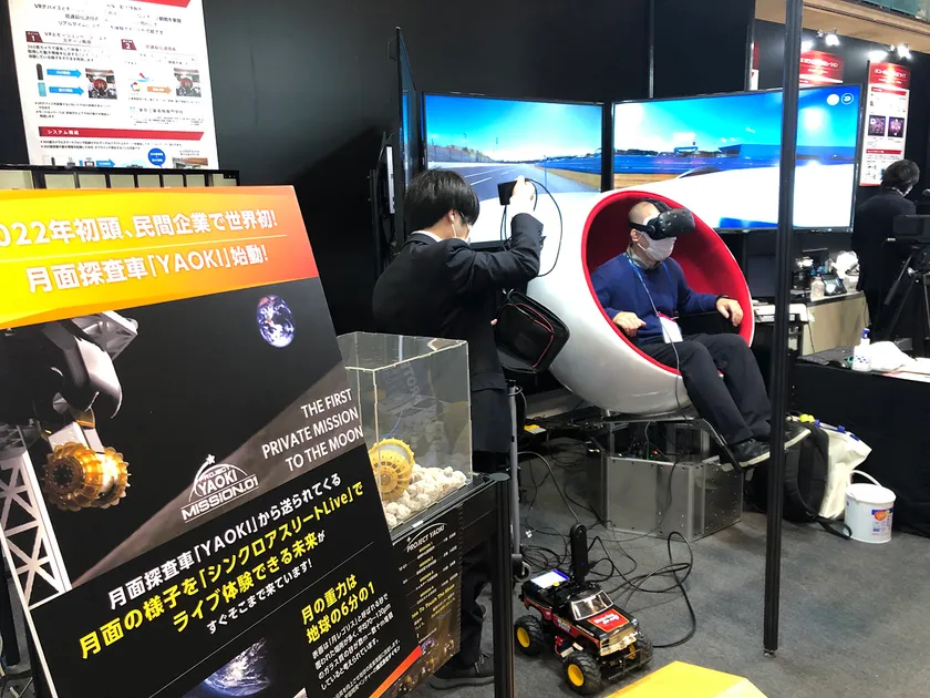 月面探査機『YAOKI』が撮影したVR映像をヘッドマウントディスプレイで視聴しながら、ジャイロセンサーと加速度センサで取得した動きのデータを元に、3軸モーターで動作するモーションベースで再現することができる『シンクロアスリートLive』を使ったデモ展示となります。また、超短焦点プロジェクターと大スクリーンを3台設置。VRシアターとしても映像を視聴することができます。