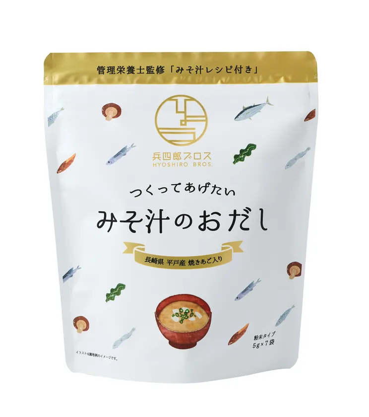 あご入りだしパックの元祖【味の兵四郎(ひょうしろう)】に新ブランドが仲間入りしました。その名も“兵四郎ブロス”です。幅広い年代層の方に手軽に使っていただけるように味や価格設定を徹底的に追求した新しいブランドです。その“兵四郎ブロス”の第一弾商品として発売しました『つくってあげたいおみそ汁のおだし』は全国のスーパーなどを中心にご好評いただいており取扱店がどんどん増えていっています。パックを破ってお湯にサッと溶かすだけで焼きあごの深いコクと風味が活きた本格的なだしの旨味を堪能いただけるので、味噌を入れてお好きな具材を入れていただくだけで味わい深いおみそ汁が簡単にできあがります。
