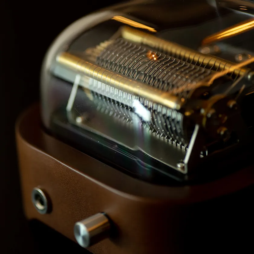 という通常のオルゴールでは不可能だったテンポが速い音源の再生、難しいメロディや現代のポップな音源も再現することに成功しました。また最先端のオルゴールでありながら、従来のオルゴールの良さでもあるシリンダーで櫛を響かせることで発生する“1/fの揺らぎ”もしっかり体感できます。