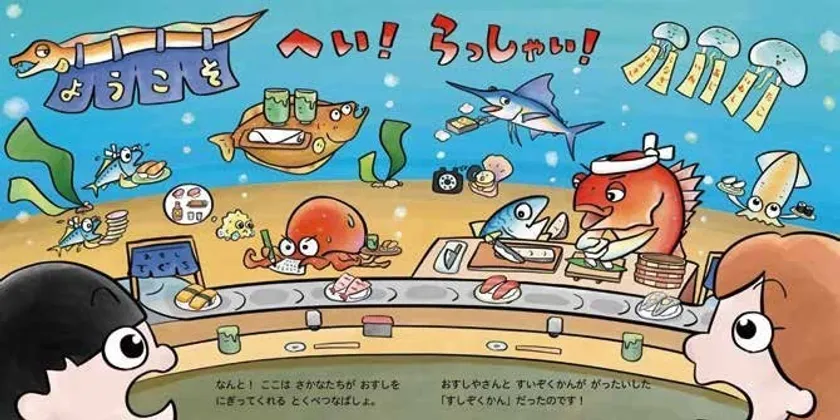 本書企画のきっかけは、著者が「水族館でお寿司を食べられたらいいなぁ……」と思い描いたことから生まれたファンタジー。ハチマキを巻いた水槽のさかなに「トロください」と注文してみると、さかなが握って「へいおまち!」。横からシュッとお寿司の皿が……。いろいろな魚に出会い、その生態を学びながら楽しく食育できるポップなタッチの絵本です。
