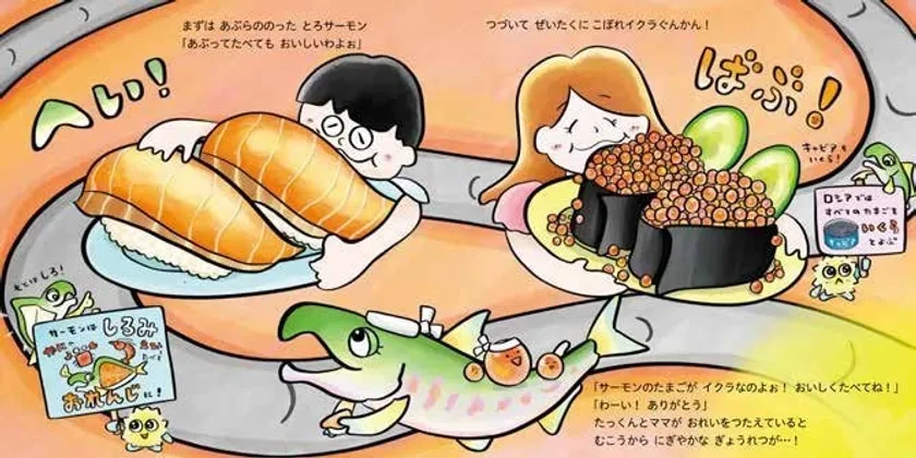 ▲サーモンといくらが親子であること、泳いでいるお魚からお寿司ができることなどストーリーや絵から子どもたちの学びへつなげる内容。